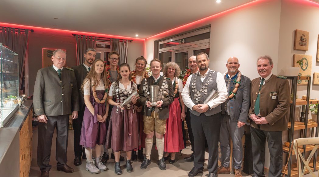 (v.l.) 2. Schützenmeister Dirk Matten, 1. Sportleiter Stefan Schallmoser, Jugend-Wurst-Königin Alexandra Elbs, Jugend-Brezn-König Tim Deitmer, Jugend-Kön...