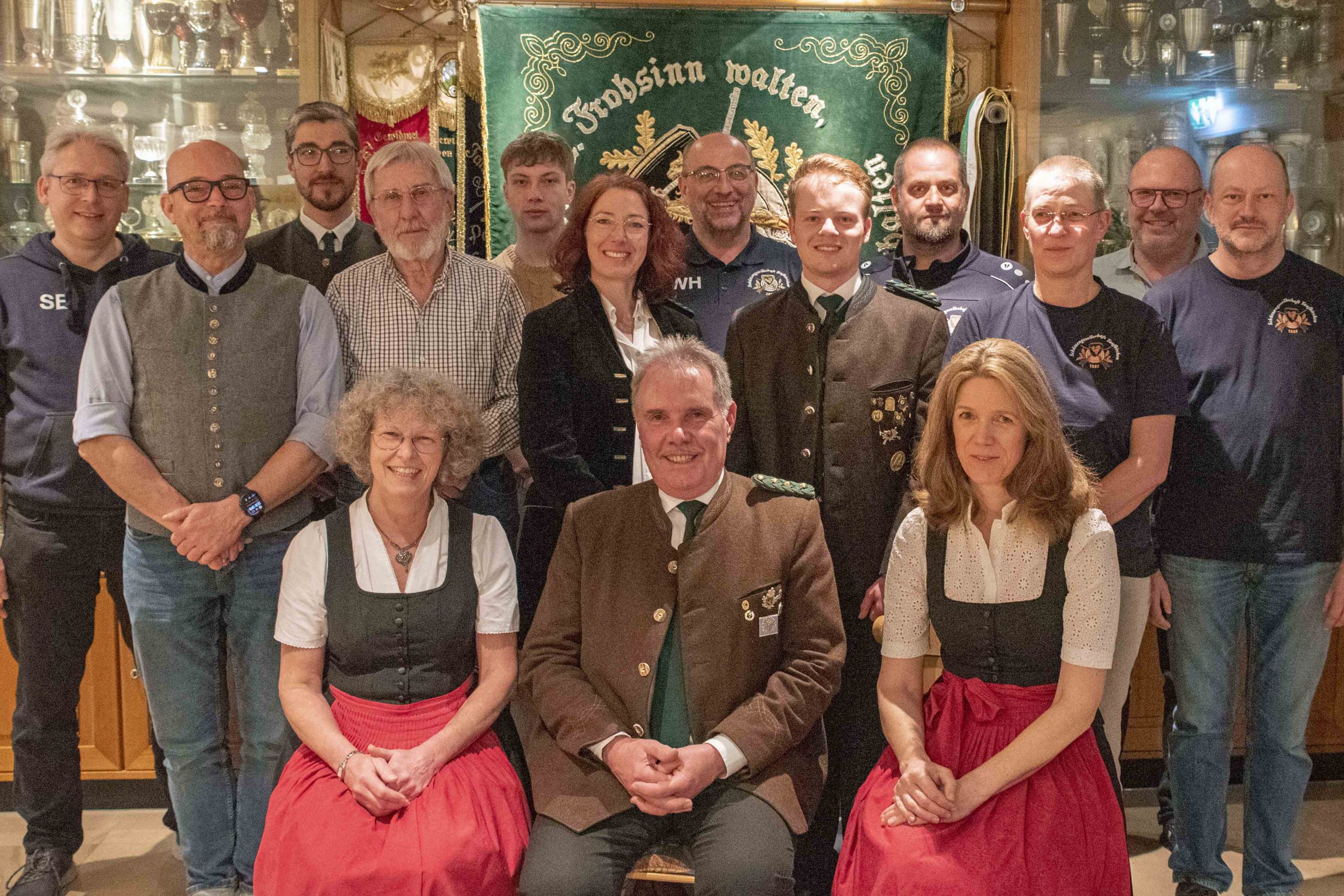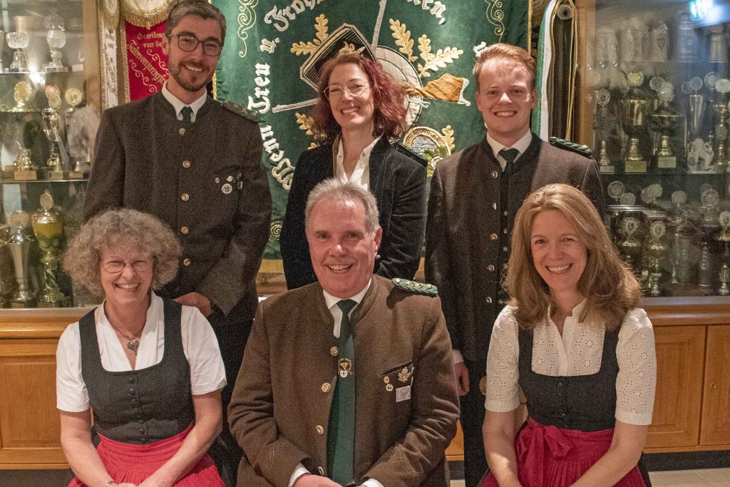 (vorne v.l.) 2. Schützenmeisterin Kirsten Bürger, 1. Schützenmeister Michael Müller, 1. Schriftführerin Maria Widmann (hinten v. l.) 2. Schriftführer Stefan Elbs, Abt.-Leiter Großkaliber Philipp Dinkel, 1. Schützenmeister Stefan Schallmoser, Beisitzer Willi Vogele, 1. Jugendleiter Leopold Dinkel, 1. Schatzmeisterin Cosima Dinkel, 2. Schatzmeister Wolfgang Herrmann, 1. Jugendsportleiter Constantin Rosengarten, Beisitzer Christian Eiden, 2. Jugendsportleiterin Katrin Beyer, 1. Salutzugkommandant Paul Haberl jun. und 2. Sportleiter Markus Beyer